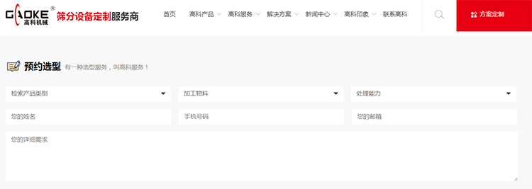 利用互聯(lián)網平臺,高科機械還推出在線預約選型服務,您只需要打開高科機械官網,在高科服務一欄中找到預約選型服務,即可在線填寫設備使用的產品類別、加工物料種類及處理能力等信息,留下聯(lián)系方式后,我們的工作人員會在兩個工作日內回復,為您提供科學合理的選型方案。