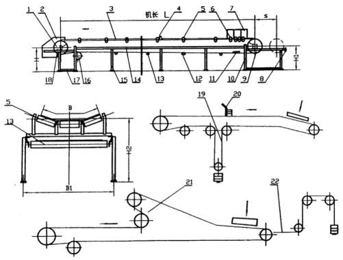? ? 1、傳動(dòng)滾筒2、頭罩3、輸送帶4、槽形調(diào)心托輥5、槽形托輥6、緩沖托輥7、導(dǎo)料槽8、螺旋拉緊裝置9、改向滾筒10、尾架11、空段清掃器12、下平調(diào)心托輥13、下托輥14、中間架15、中間支腿16、改向滾筒17、頭架18、彈簧清掃器19、垂直拉緊裝置20、犁式卸料器21、卸料車22、車式拉緊裝置
